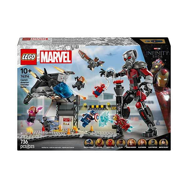Gran Batalla de Capitán América: Civil War (76314) es un juguete construible LEGO® Marvel repleto de detalles y un regalo sensacional para niños a partir de 10 años. Con 9 figuras LEGO Marvel, una aeronave Quinjet y numerosos accesorios, permite atu peque recrear sus momentos favoritos de la película y dar rienda suelta a su imaginación. El set se basa en la escena del aeropuerto que aparece en la película Capitán América: Civil War, de Marvel Studios. Viene con 8 minifiguras: el Capitán Améric a, el Soldado de Invierno, Wanda, Falcon, Iron Man, Spider-Man, la Viuda Negra y Black Panther. Incluye armas y accesorios, así como un Ant-Man de aproximadamente 24 cm de alto completamente articulado. La aeronave Quinjet tiene alas replegables ycabina abatible con espacio para la minifigura de un piloto.