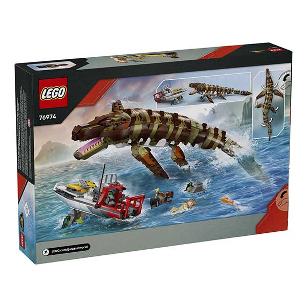 Set LEGO® Jurassic World Misión Naval: Mosasaurus Construible (76974) para niños desde 9 años. Incluye figura articulada del Mosasaurus, barco, arrecifes, maletín con jeringas y minifiguras de LeClerc y Atwater. Ideal para aventuras marinas y exposición.