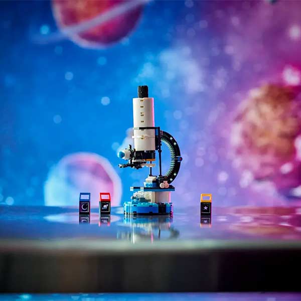 Explora tu pasión por la ciencia y el espacio con estos 3 asombrosos juguetes LEGO®. Construye un telescopio que proyecta imágenes de una estrella, un planeta o la Luna, acompañado de un sistema solar. Conviértelo después en un microscopio donde puedes iluminar y ver imágenes, o en un ovni que emite luz desde su tren de aterrizaje. ¿Qué vas a construir? Tú decides con este fantástico set “3 en 1”.